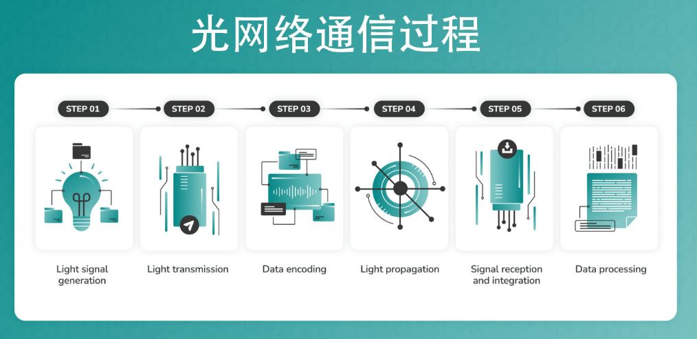 光網(wǎng)絡(luò)通過利用光信號(hào)通過光纖電纜傳輸數(shù)據(jù),從而創(chuàng)建快速通信框架。該過程涉及光信號(hào)生成、光傳輸、數(shù)據(jù)編碼、光傳播、信號(hào)接收和集成以及數(shù)據(jù)處理。