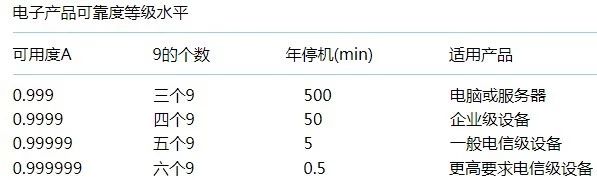 對電子產品而言,常用可用度n個9來描述產品可靠性水平。n個9表示在1年運行中,系統正常使用時間與總時間之比。